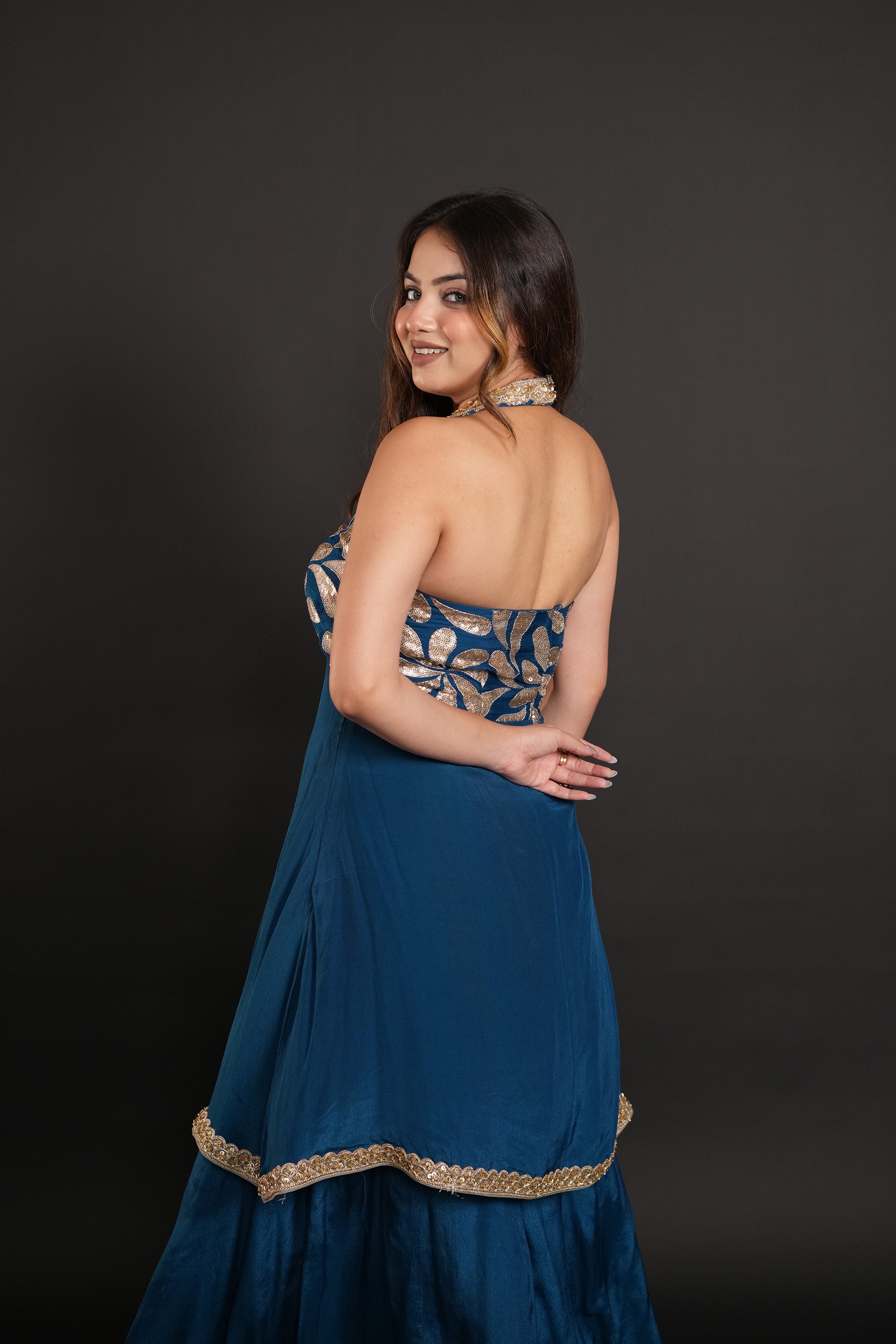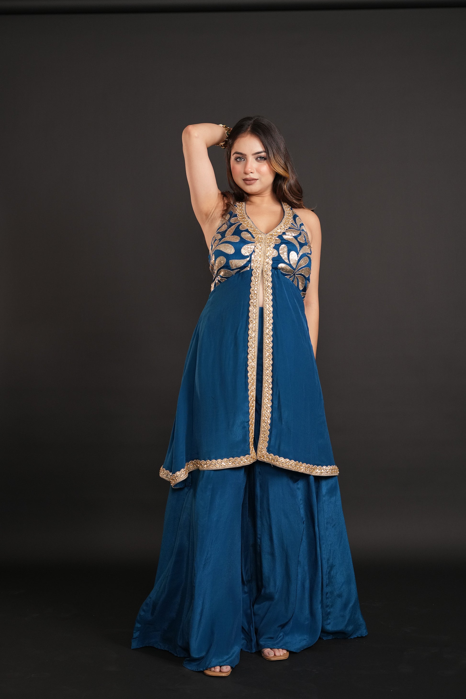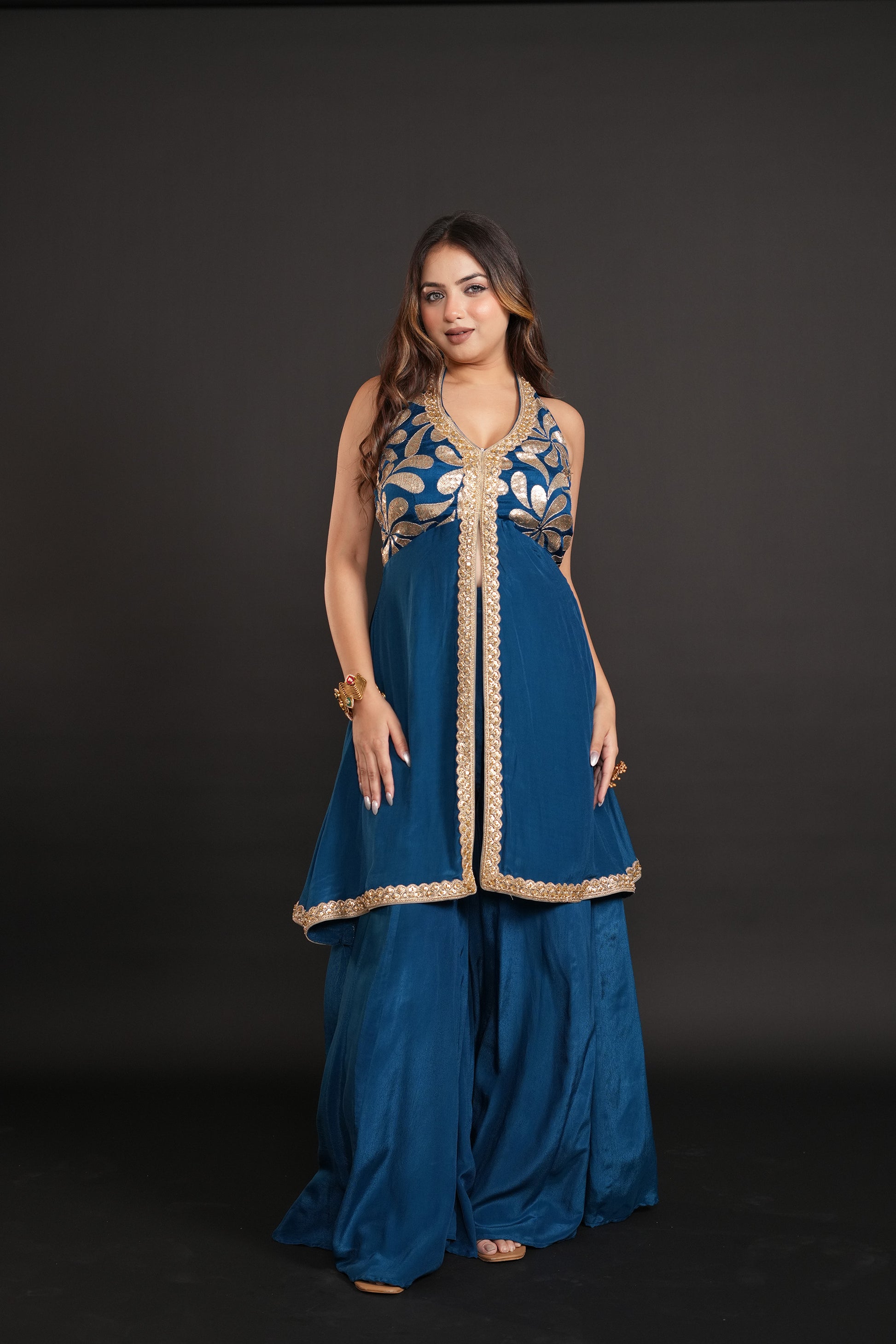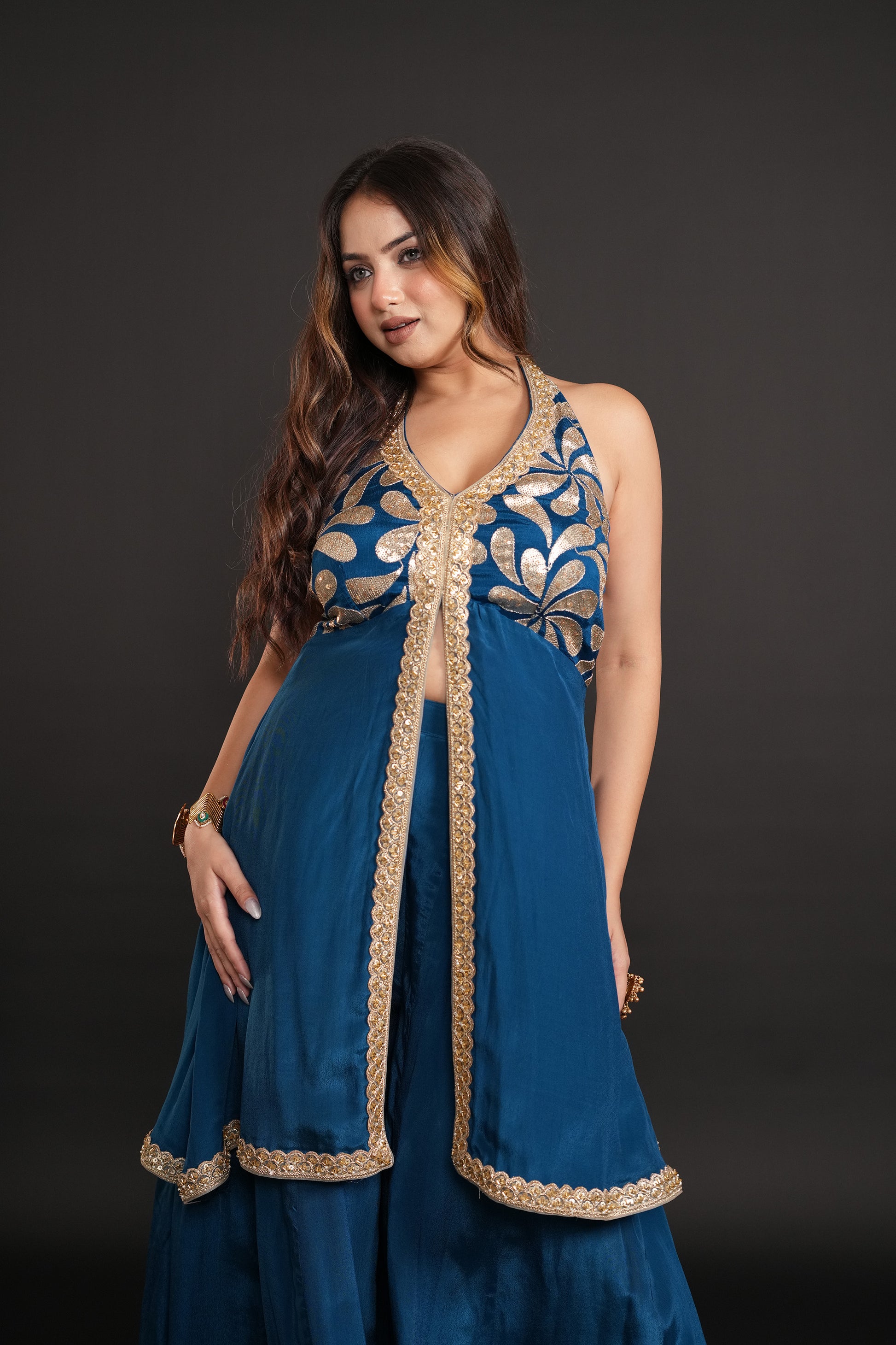 Teal that steals the spotlight! this dreamy crepe gharara set comes with glam bustier attached fit flirty , flowy, and lace kissed layers. designed to twirl , stun, and repeat.